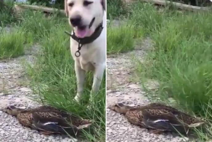 Na ovom snimku jedna patka je pred šapama psa glumila da je mrtva. On je neko vreme stajao nad njom čekajući da vidi šta će se desiti, ali, pošto, ona nije mrdala pokupio se i otišao. Čim se udaljio, patka je skočila na noge i hitro se odgegala.