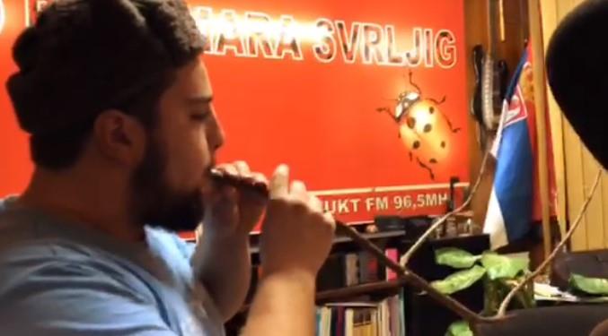 Filip svira u granjku, verovali ili ne. Grana od drveta, lepo izrezbarena ovom mladom čoveku služi kao muzički instrument i na njoj on odlično svira Svrljišku rumenku i ostala kola iz ovog kraja.