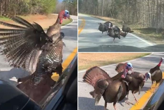 Ko će znati šta se dešava u ćurećem mozgu, ali da imaju čudne porive, to nema dileme. U to se uverio i jedan američki vozač kojem su tri ptice presekle put.