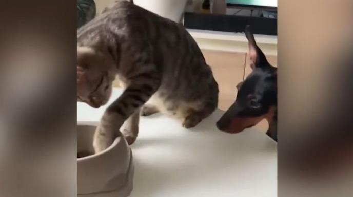 E TO SU PRAVI PRIJATELJI! Maca jede svoju hranu, a doberman stoji i gleda! Ona počinje da vadi zrnca šapicom i da ga hrani! (VIDEO)