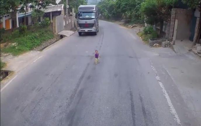 Na snimku se vidi beba od oko godinu dana koja izlazi na ulicu, čovek u čijem kamionu je nastao video počinje da trubi drugom kamiondžiji koji ide pravo na dete. Zaustavljaju se obojica, beba je i dalje na sred ulice. Nailaze dva motora koji staju, jedan vozač silazi, uzima bebu i sklanja je sa puta.