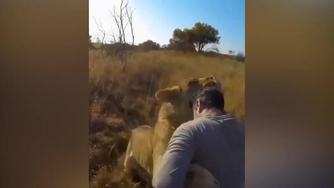 IPAK SU ONI SAMO MAČKE! Pogledajte kako se maze i umiljavaju lav i lavica sa čovekom u divljini, ali to nije sve, oni mu čak skaču u zagrljaj! (VIDEO)