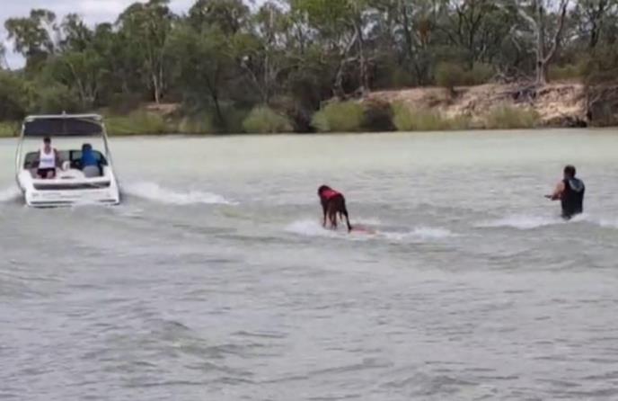 Čamac koji vuče skije kreće, kuca u prvim sekundama uspostavlja balans i nastavlja da uživa u vožnji, dok za to vreme njegov gazda pokušava da se ispravi na skijama, nespretno se održava i na kraju upada u vodu.