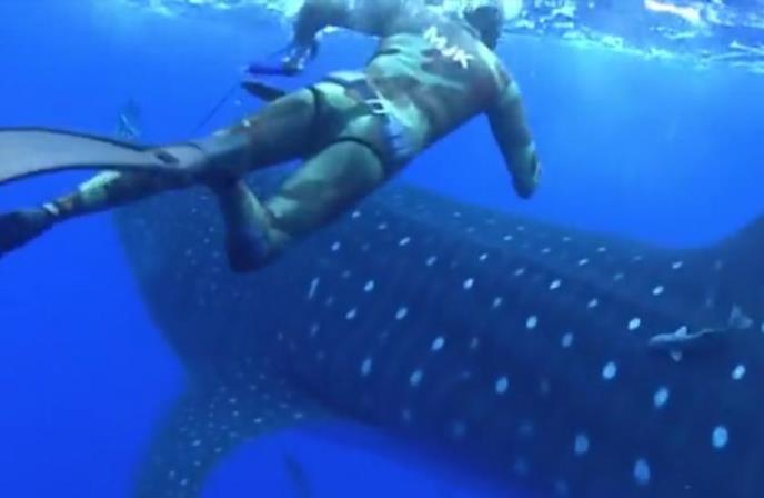 Dva prijatelja su ronila u vodama Atlantskog okeana, jedan je snimao drugog i veliku tunu koja je plivala pored njih. U jednom trenutku prijatelj koji je u kadru počinje da pokazuje levo, iza leđa svog druga. Momak se okrenuo, a iznenađenje mu je već bilo ispred nosa. Ogromna kit ajkula udarila je ronioca, a na snimku se čuje i njegov krik iznenađenja. Ajkula se okrenula i nastavila da pliva sa drugim roniocem.