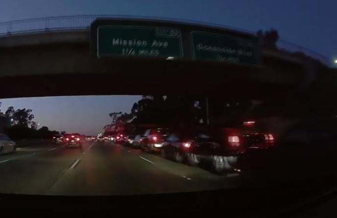 Jedan vozač u Kaliforniji snimio je lančani sudar u kome je učestvovalo pet automobila. Sa desne strane na snimku, vidi se crni automobil koji menja traku, ispred njega džip kreće da koči, a vozač crnog automobila ne reaguje na vreme, udara u džip, koji zatim udara auto ispred sebe, i još dva automobila.