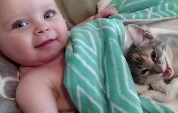 Osmomesečna devojčica i njena maca Iv zaspale su zajedno, a kada su se probudile bebina mama se toliko raznežila kada je videla kako se maze, da je uzela telefon i snimila ovaj prizor. Mama je želela da njena devojčica odrasta uz ljubav životinja, pa je nabavila mače koja beba obožava. Čim se probudila otvorila je svoje krupne plave okice i u čudu slušala mijaukanje: -Moraš da je utešiš, ona plače za tobom.-rekla je mama devojčici.