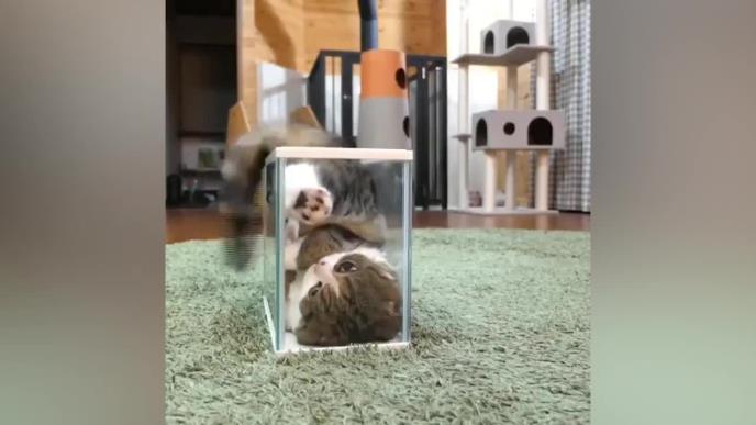 BAŠ TOTALNO LUDA MACA! Ušla u staklenu kockastu posudu, prevrnula se na glavu i ne pada joj na pamet da izađe! (VIDEO)