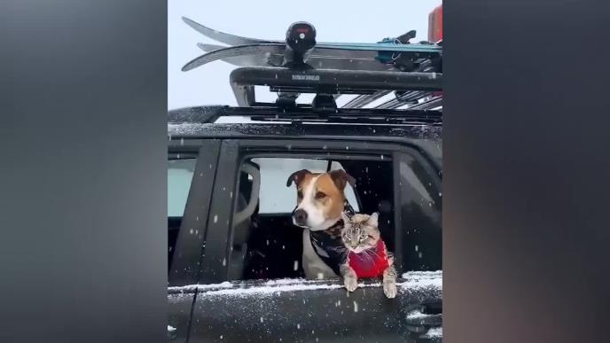 Pada sneg, a u automobilu pas i mačka u zimskoj garderobi čekaju gazdu.