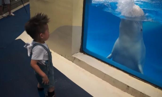 Mladi i neustrašivi dečak došao je do akvarijuma u kom se nalazilo mladunče kita i hrabro ga pogledao u oči i zauzeo gard.