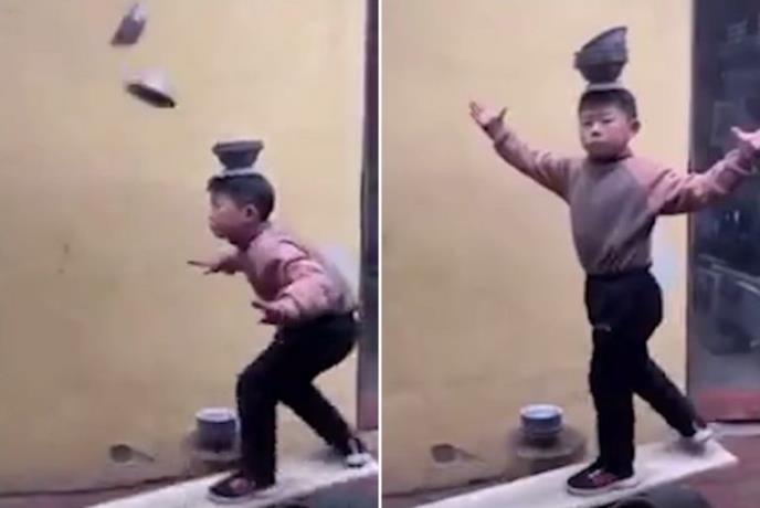 Ovaj dečkić pokazuje već zavidno umeće, gde balansira na dasci ispod koje je valjak, a u isto vreme sebi nabacuje činiju na teme. I ne samo jednu, već i dve, pa i tri odjednom.