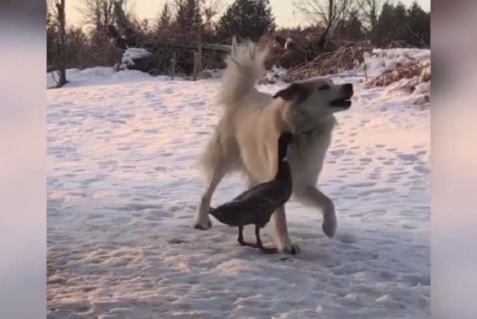 Čim se Flojd, veliki pirinejski pas, pojavi u dvorištu jedna od pataka iz jata odmah mu pritrči u susret. Njih dvoje su odlični prijatelji i odmah kreće razmena nežnosti. Pas se počinje da se isteže dok patka kao da pokušava da ga zagrli. Po tome kako Flojd vrti repom, a patka se umiljava, reklo bi se da obe životinje uživaju.
