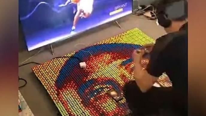 Stiven Brandedž, talentovani umetnik iz Los Anđelesa uspeo je da napravi neverovatno realističan prikaz čuvenog košarkaša Kobija Brajanta koji je, podsetićemo, u nedelju 26. januara poginuo u helikopterskoj nesreći zajedno sa svojom ćerkom Điđi. Ova tragedija potresla je celu planetu, a navijači širom sveta odaju počast NBA legendi. Neki rečima, neki fotografijama, a umetnici poput Stivena ovakvim muralima.Pogledajte kako izgleda Brajantov portret za čiju izradu je bilo potrebno čak 814 rubikovih kocki složenih tako da prate zadatu šemu boja i više od 20 sati rada.
