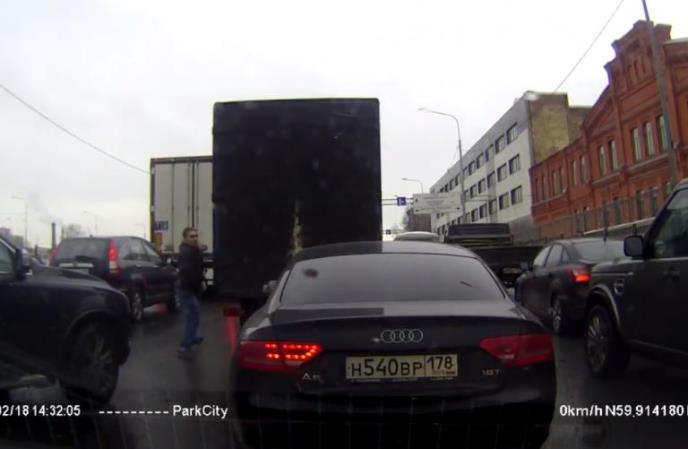 Na samom početku vidimo kamion koji je isekao, i praktično izgurao u drugu traku crni Audi. Vozač automobila pokušao je da nastavi svojim putem, ali je kamiondžija bio jači i uporniji, bar na prvu loptu. Auto propušta kamion i kreće da vozi iza njega. Čim su se zaustavili zbog gužve u saobraćaju. besni vozač Audija je izašao, prišao kamionu, izvadio nož i probušio mu zadnju gumu.