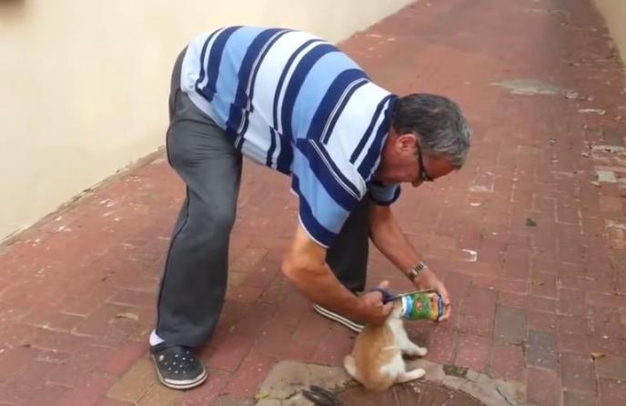 Dok je bacao smeće, čovek je video mačku sa glavom zaglavljenom u flaši od tvrde pastike. Zamolio je prolaznika da ga snimi dok je pokušavao da pomogne mačetu, da bi mogao da pokaže svojim unucima kasnije tog dana na večeri. Mače je u potrazi za hranom gurnulo glavu u flašu koja je bila u smeću. Kada ga je ovaj čovek pronašao, već je bilo izmučeno i malaksalo. Verovatno su ga sati delili od tragičnog kraja. Ipak, imao je sreću da bude pronađen i da gospodin da sve od sebe da ga izbavi. Uzeo je makaze, pa klešta. pokušavao na sve načine i na kraju uspeo, a ponos koji je osetio vidi mu se na licu.