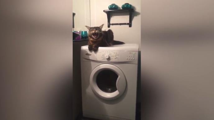 Ova mačka je na veš mašini doživela pravi zemljotres, ali toliko je bila uporna da ostane na njoj, da je to zaista komično. Najsmešnije od svega je što se ona cela trese, posebno njene uši i šape, ali ne želi da siđe sa veš mašine. Ipak uporno mjauče i traži pomoć.