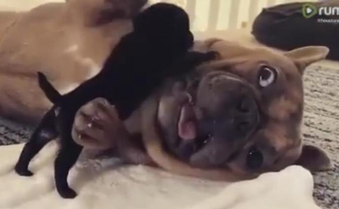 KAKO LI GA SAMO TRPI!? Tek rođeno štene mopsa ne prestaje da urniše francuskog buldoga! (VIDEO)