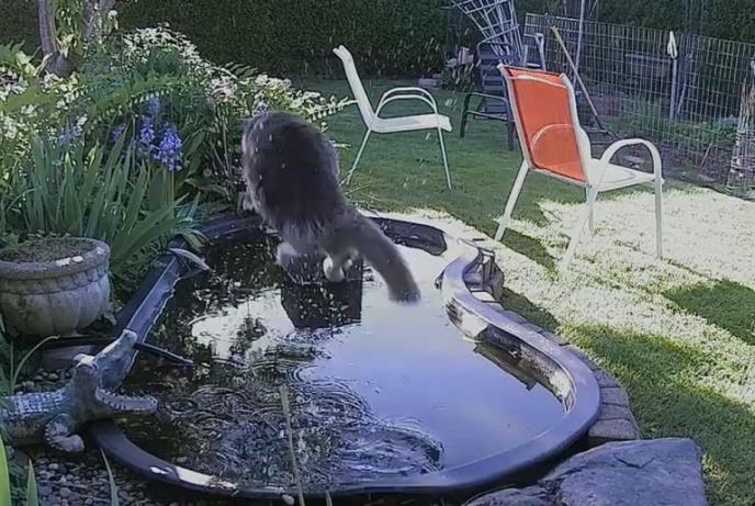 Sigurnosna kamera iz jednog dvorišta u kanadskom gradu Čilivak snimila je komičnu situaciju kada je komšijska mačka došla da pije vode sa veštačkog jezerceta.