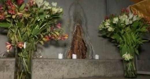 Oko mrlje su postavljeni cveće i sveće, dok se pored na improvizovanom oltaru nalazi statua Device Marije, prenosi Daily mail.
