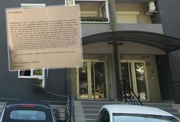 "Sa žaljenjem vas obaveštavam da smo započeli sa učenjem našeg sina da se sam uspava. Nakon mnogo neprospavanih noći, zahvaljujući zastrašujućem četvoromesečnom nedostatku sna, odlučili smo da je vreme da započnemo s metodom "pusti ga da plače". Ako čujete plač, molim vas, molite se za mene i znajte da i ja plačem i ludim. Jako mi je žao zbog neprijatnosti koje bi vam ovo moglo stvoriti, nadamo se da neće potrajati dugo", stoji u pismu.