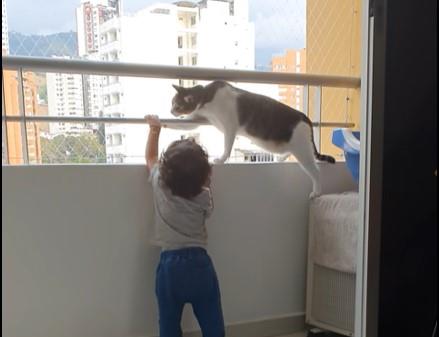 I posle kažu mačke su zle! A ovaj snimak prikazuje anđela čuvara u obliku mace koja čini sve da malenog spreči da se rukicama drži za ogradu, popne se i padne.