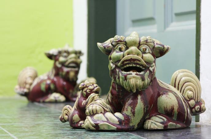 Interesantno je napomenuti da lav nije životinja koja je autohtona u Kini. Veruje se da su putnici u Kinu donosili priče o lavovima kao budističkim zaštitnicima Darme. Kipovi lavova su bili oblikovani u feng šuiju na osnovu opisa putnika i crteža inspirisanih njihovim rasama pasa.