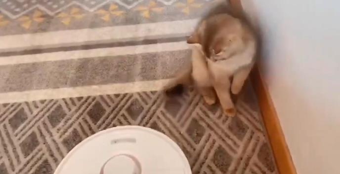 Na taj spisak su dodati i roboti-usisivači koji sami obavljaju dosadni posao. Ovaj robot je prišao mački u želi da usisa taj deo kuće, a on je poskočila na veoma komičan način.