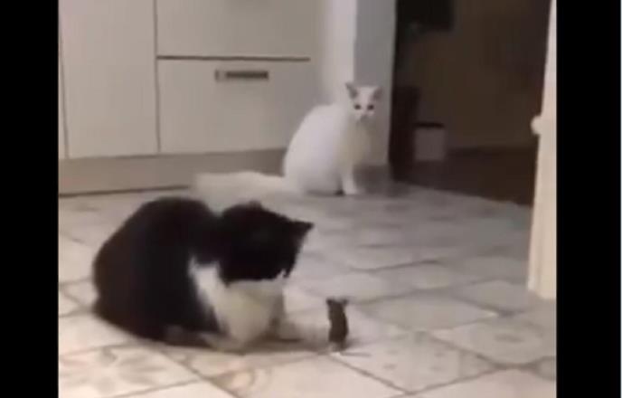 Ovaj muškarac snimio je svoje mačke u društvu jednog miša. Iako bi po svoj logici stvari mačke trebalo da napadnu miša, ali one su nekako nesigurne, a miš za to vreme trči po kuhinji i ne obazire se mnogo nakrznene neprijatelje.