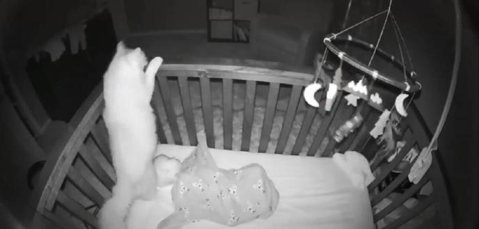 Naime, mačka se noću uvlači u bebin krevetac. Ne želi da se odvoji od svog malog prijatelja, pa ga budnim okom motri, dok roditelji čvrsto spavaju. Kad joj sedenje dosadi, poigra se s vrteškom iznad detetove glave ili vešto prošeta po ogradi kreveca.