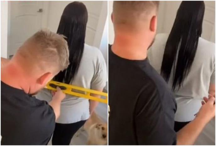 Kako bi to što bolje uradio, on je pronašao svoju libelu i prionuo na posao. U videu se vidi kako postavlja libelu na kosu svoje supruge i procenjuje koliko treba da skrati. Na kraju, nije odradio loš posao, a supruga je ostala impresionirana.