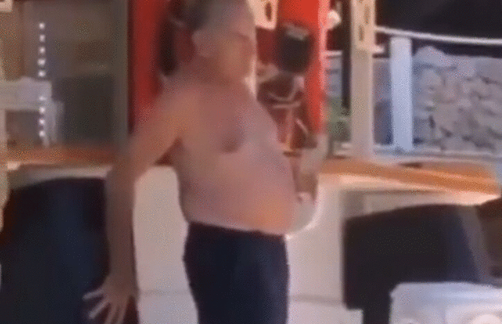 Najpre se pridržava za nešto što liči na stub i pravi pauzu, kao da skuplja hrabrost da krene dalje. Zatim hrabro kreće u "nepoznato" i počinje da ide u cik-cak sve vreme držeći čašu u ruci. Uspeo je da izdrži nekoliko koraka, ali gravitacija čuda čini pogotovu kada je neko pod "gasom" pa je ubrzo završio odakle je krenuo, ali sa glavom nadole. Gospodin je tresnuo o zemlju i prosuo piće.