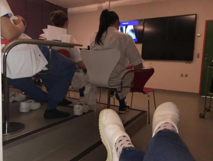 - Koji šok sam doživela kada sam prvi put otišla na predavanje. Prvo, svi su obavezno ispred sebe, pored laptopova, držali hranu. Među hrpom papira virila je kafa. Profesor, koji takođe radi u bolnici, uletio je u salu, uopšte ga ne brine što jedan jede, drugi pije kafu. On je odmah počeo sa predavanjima, priča što treba da studenti čuju, pokazuje, ma uopšte nije uvređen što ga svi ne gledaju. Ja gledam koleginicu, ona se izula i digla noge. Ja u šoku, i dalje ne verujem, ne opominje je. Zaplakah od muke. I ja izuh klompe, ispružih se i poslah sestri u Srbiju sliku. Nek je sa srećom, posla sestra odgovor, sad letiš napolje. Ne da nisam izbačena, nego ne mogu da joj objasnim kako to ovde funkcioniše. Briga profesora šta ti radiš, on je ispredavao svoje, a da li ćeš ti za to vreme da jedeš, piješ kafu, spavaš... njega to ne zanima. Važno je da on je rekao šta je imao, a sigurno je da ćeš morati to da znaš kad dođe vreme ispita.