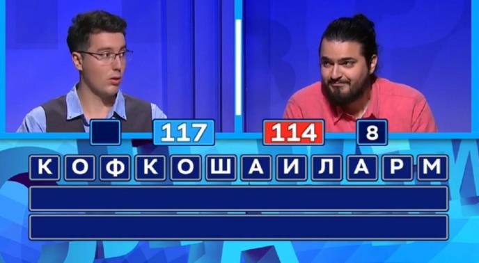 Od ponuđenih slova bilo je neophodno složiti reč koja ima smisao. Voditeljka se obratila takmičarima nakon isteka vremena predviđenog za razmišljanje i uobičajeno upitala od koliko slova se sastoji njihova reč. Obojica su rekla "osam". Potom je takmičaru koji ima prednost rekla: "Branimire, iznenadite nas."