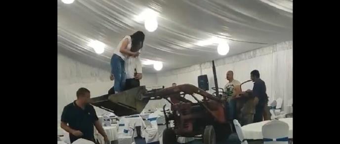 Na Tviteru se pojavio zanilmljiv video sa nekog slavlja u Srbiji. Naime, kamera je uhvatila par koji se veseli na kašiki za bager koja je prikačena na traktor usred šatre.