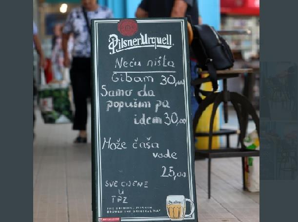 "Samo da pojedem" će vas koštati 45 kn (oko 700 dinara), a "čekam prijateljicu" 20 (300 dinara). "Gde je WC?" se plaća dobrih 60 kn (900 dinara). "Samo da popušim i idem" je 30 kn (oko 500 dinara), jednako kao i "Neću ništa, idem", a čuveno "Može čaša vode" je 25 kn (400 dinara).