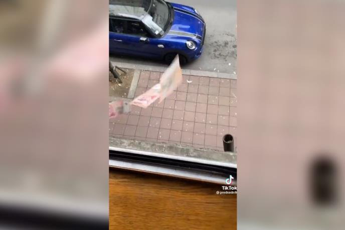 "Upravo ću izbaciti neki keš kroz prozor da vidimo kako će ljudi reagovati i da li će ga neko pronaći", kaže on na početku snimka dok drži novčanice od 500 i 1.000 dinara u ruci, a onda nekoliko njih baca na ulicu.