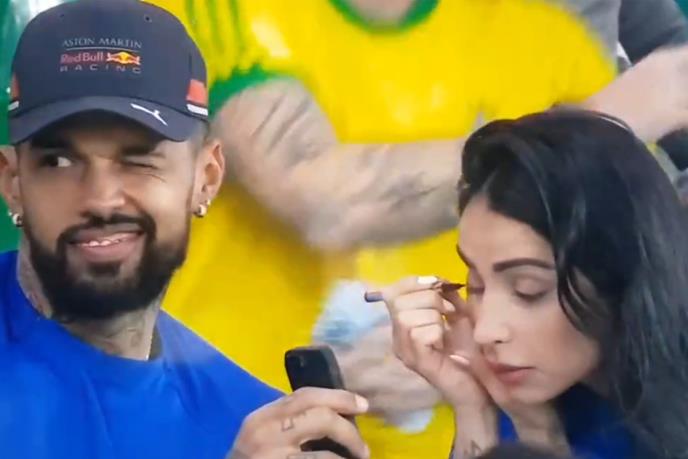 Međutim, dok je ona koncentrisano popravljala ajlajner, a on držao telefon posmatrajući usput šta se dešava oko njega, na terenu i na tribinama, u jednom trenutku je nekom značajno namignuo i nasmejao se.