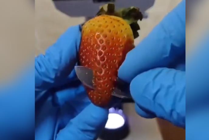 Na snimku se vidi kako čovek uzima jagodu, seče je po površini i stavlja na pločicu pod mikroskopom. Onda se na snimku vidi da po jagodi šeta nešto što podseća na grinje.