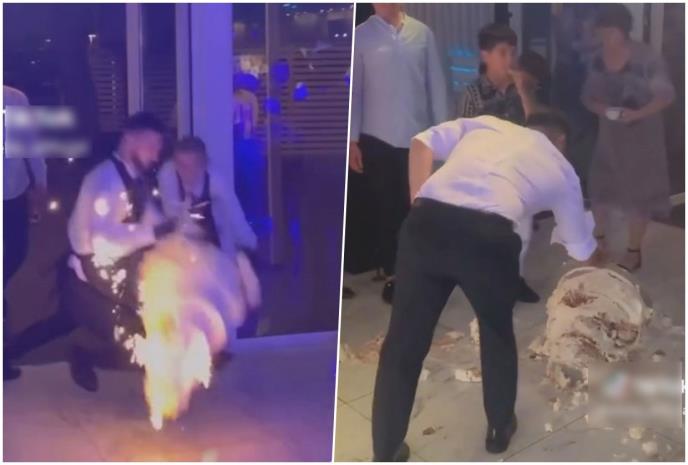 Društvenim mrežama se širi snimak s jedne svadbe na kojoj je konobarima svadbena torta ispala na pod, i to sa sve prskalicama na njoj.