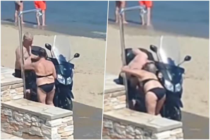 Muškarac i žena snimljeni su na jednoj hrvatskoj plaži kako pod tušem peru svoj skuter.
