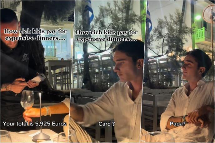 "Vaš račun, ukupno 5.925 eura. Kako želite da platite? Kešom, karticom?", upitao je konobar, a momak je rekao: "Tata? Može li moj otac da plati?". Otac je ljutito uzeo novac, a njegov naslednik je poručio: "Moja kartica je ovde", misleći na oca.