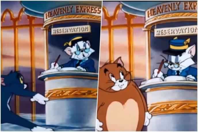 U epizodi “Heavenly Puss” Tom privremeno posećuje vrata raja nakon što je zadobio povredu tokom borbe s mišem Džerijem. Zlatne pokretne stepenice vode ga do vrata pred kojima mačke stoje u redu kako bi se ukrcale na voz – Heavenly Express, prenosi Avaz.