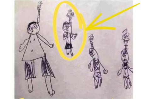Mališan je nacrtao svoju porodicu na prilično neobičan način, te se na crtežu čini kao da vise na užetu. Ovo je zabrinulo učiteljicu, koja je odmah pozvala roditelje mališana u školu.