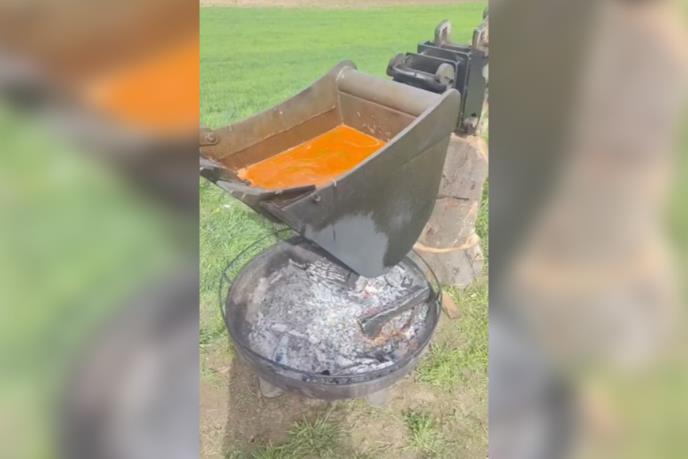 A kako se može videti na njemu, iznad pripremljene vatre i žara, gulaš se krčkao u kašiki bagera guseničara.