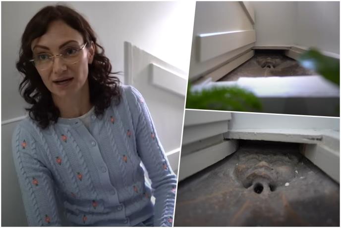 Objavljeni snimci prikazuju lice “besnog” gargojla kakvo bi mogli da zamislite na Drakulinom zamku. Nalazilo se ispod drvene ploče, nadomak WC šolje.