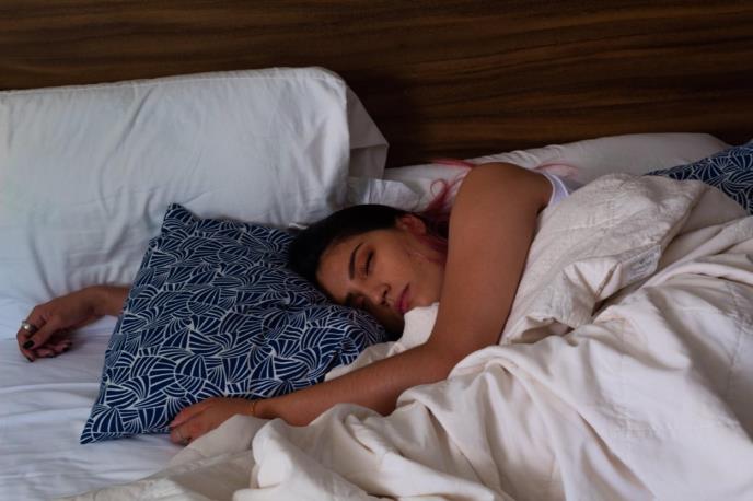 devojka u sivoj pidžami leži na levoj strani sa rukama ispod lica i spava