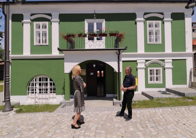 - I naravno ova kuća je sačuvana, spoljašnost je sačuvana autentično i ovo je jako važno, jednu do dve decenije bila je moderna zelena boja, tako da je još kada je oko 1870. godine vršena su detaljnija rekonstrukcije ove kuće, Zavod za zaštitu spomenika kulture je insistirao da ova kuća ostane u zelenoj boji, upravo da svedoči tu modu i to vreme. I ova terasa ovde koja se vidi, sa nje su se vladari dinastije Obrenović obraćali Čačanima.