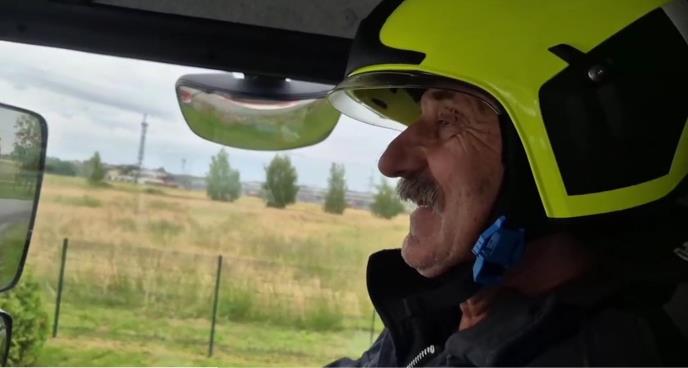 "Kaj sad to, kaj sad to", pita svoje kolege, a onda vatrogasno vozilo skreće prema lovačkom domu gde ga dočekuju njegovi kolege.