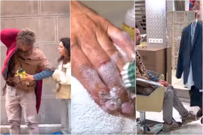 Kako se vidi na snimku, koji se pojavio na društvenim mrežama, on je sedeo na ulici kad mu je prišla jedna devojka i ubedila ga da pođe s njom u salon kako bi ga sredila. Od kose i brade mu se ni oči nisu videle, a teško je bilo uopšte porceniti koliko ima godina.