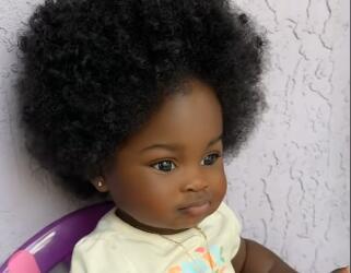 Devojčica sedi na plastičnoj stoličici. Na sebi ima žutu majicu kratkih rukava i narandžasti šortsić, dok je akcenat na bujnoj kosi i afro-loknama koji joj daju magičan izgled.