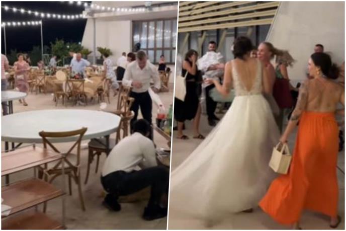 Svi su se uključili kako bi sprečili štetu. Konobari, zvanice i mladenci zajedno su pokušavali da zadrže određene stvari, prenosi Mondo.